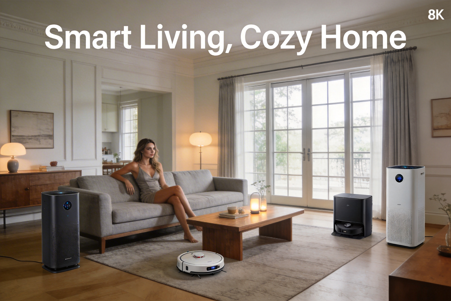 Enjoy a tidy, connected living room with smart cleaning, lighting, and security. Simple control, warm atmosphere, total relaxation.